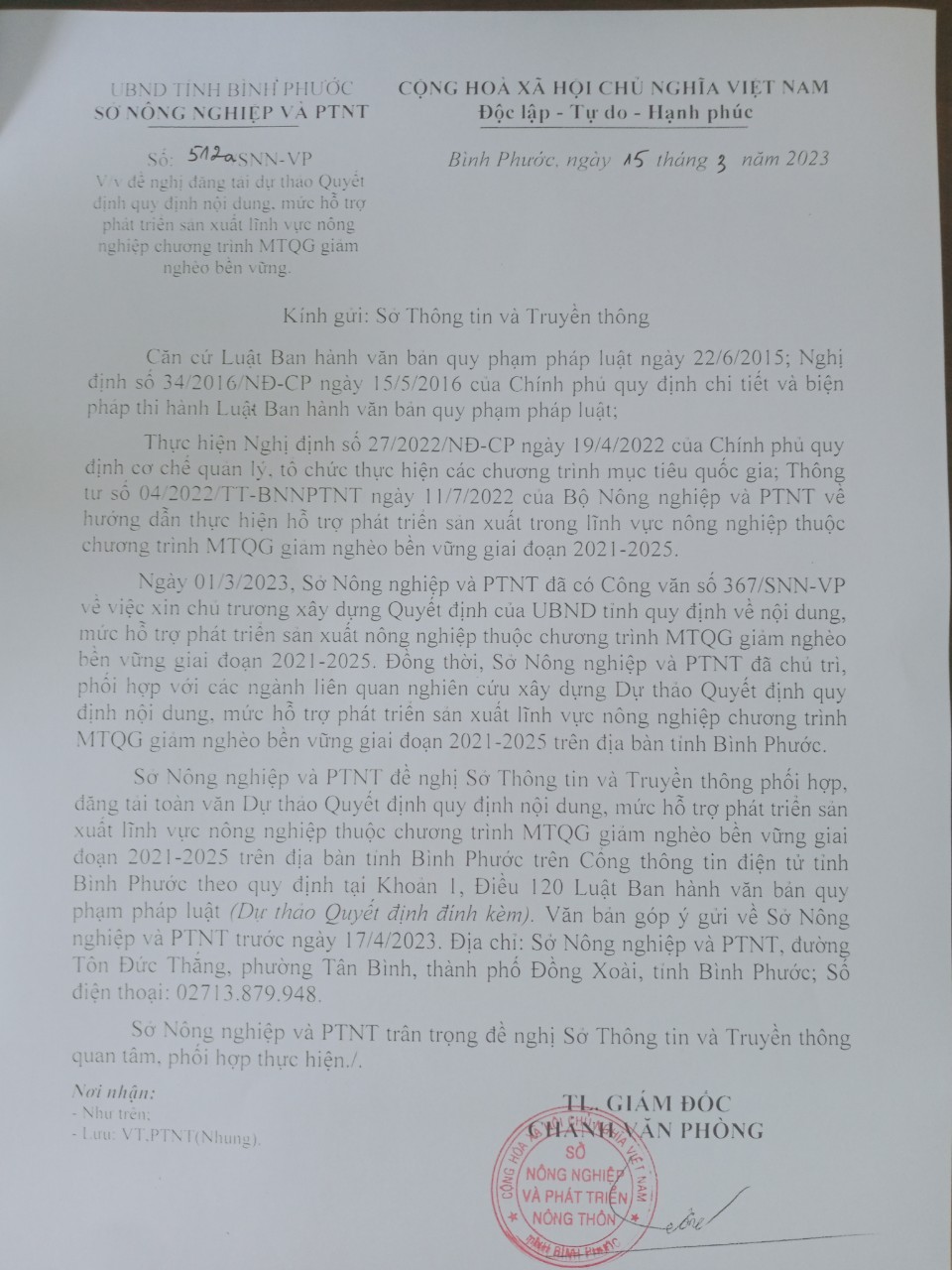 Lấy ý kiến dự thảo Quyết định Quy định nội dung và mức hỗ trợ phát triển sản xuất trong lĩnh vực nông nghiệp thuộc Chương trình mục tiêu quốc gia giảm nghèo bền vững giai đoạn 2021-2025 trên địa bàn tỉnh Bình Phước