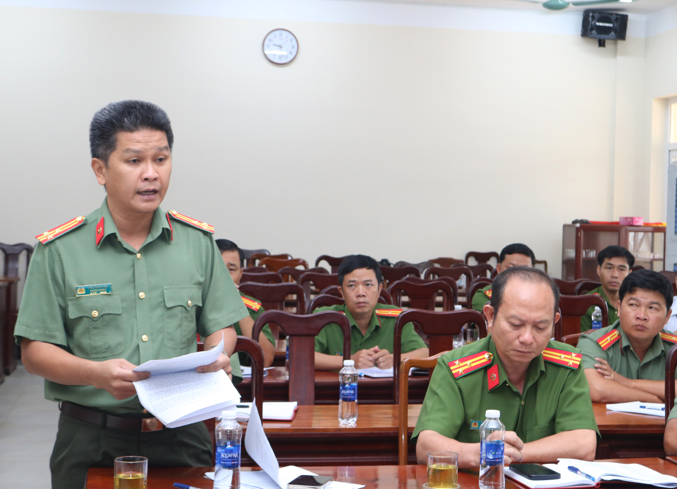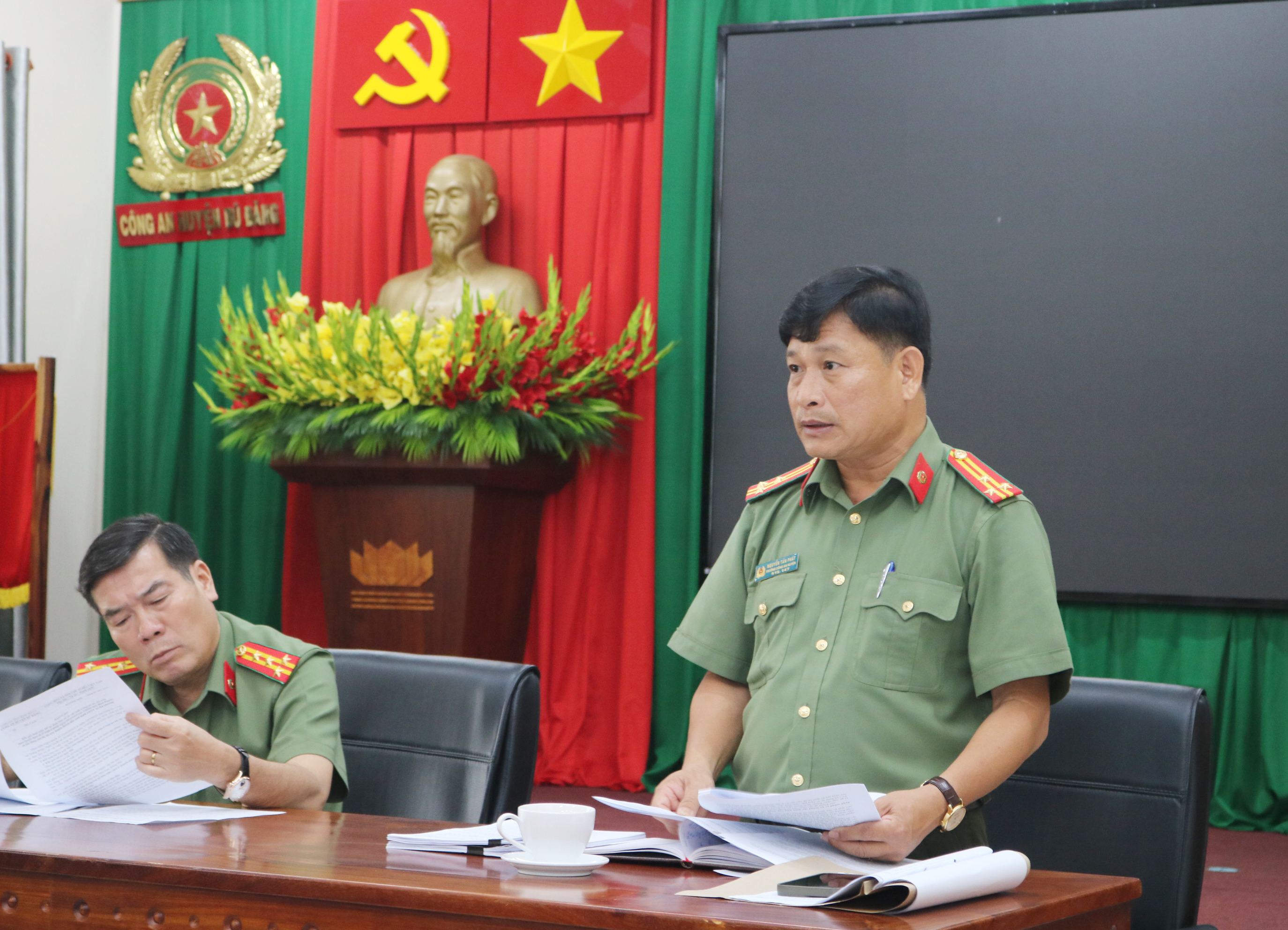 Thượng tá Nguyễn Tấn Phát - Trưởng Công an huyện báo cáo tại buổi làm việc