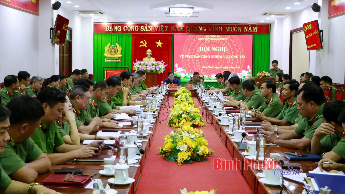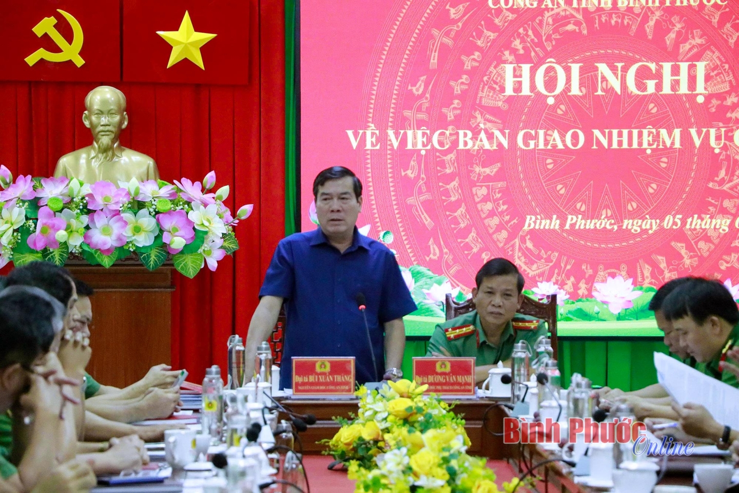 (CTTĐTBP) - Chiều 5/6, Công an tỉnh Bình Phước tổ chức hội nghị bàn giao nhiệm vụ công tác giữa Đại tá Bùi Xuân Thắng, nguyên Giám đốc Công an tỉnh và Đại tá Dương Văn Mạnh, Tỉnh ủy viên, Phó Bí thư Đảng ủy, Phó giám đốc được giao phụ trách Công an tỉnh. Dự hội nghị có các đồng chí trong Đảng ủy, Ban giám đốc, lãnh đạo các phòng, trại, cơ quan và chỉ huy một số đội nghiệp vụ trong Công an tỉnh.