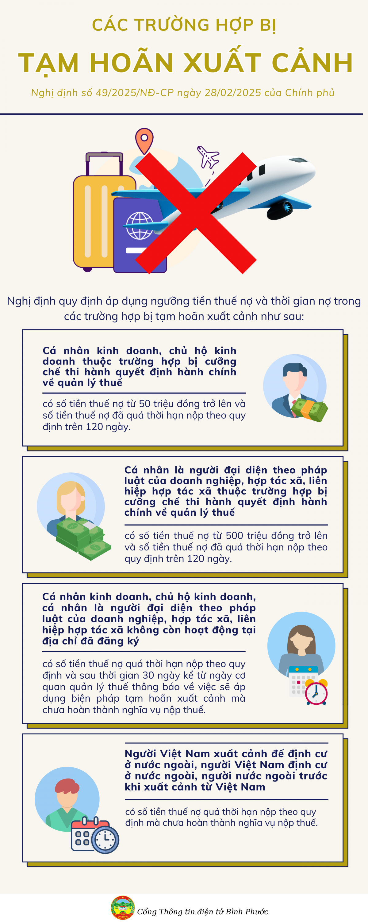 (CTTĐTBP) - Chính phủ vừa ban hành Nghị định số 49/2025/NĐ-CP ngày 28/2/2025 quy định về ngưỡng áp dụng tạm hoãn xuất cảnh. Trong đó, Điều 3 Nghị định quy định quy định áp dụng ngưỡng tiền thuế nợ và thời gian nợ trong các trường hợp bị tạm hoãn xuất cảnh như sau: