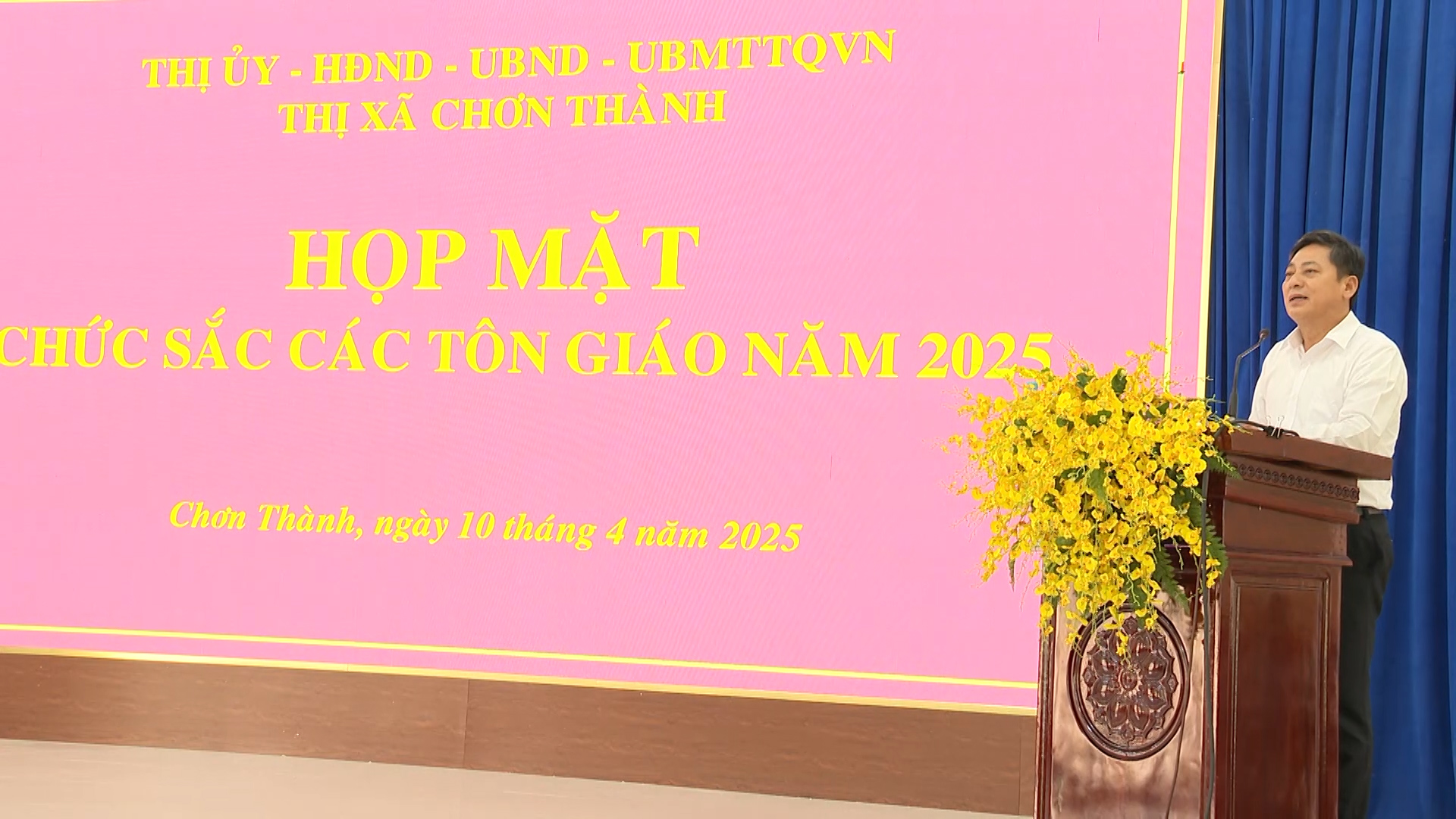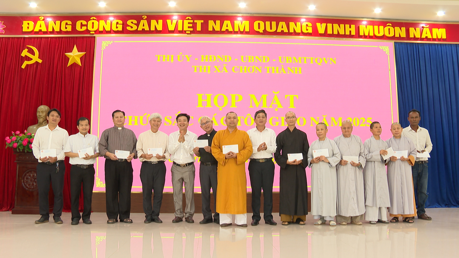 (CTTĐTBP) - Ngày 10/4/2025, Thị ủy - HĐND - UBND - Ủy ban MTTQ Việt Nam thị xã Chơn Thành đã tổ chức họp mặt chức sắc các tôn giáo năm 2025. Tham dự buổi họp mặt có Phó Bí thư Thường trực Thị ủy, Chủ tịch HĐND thị xã Hà Duy Đạt.