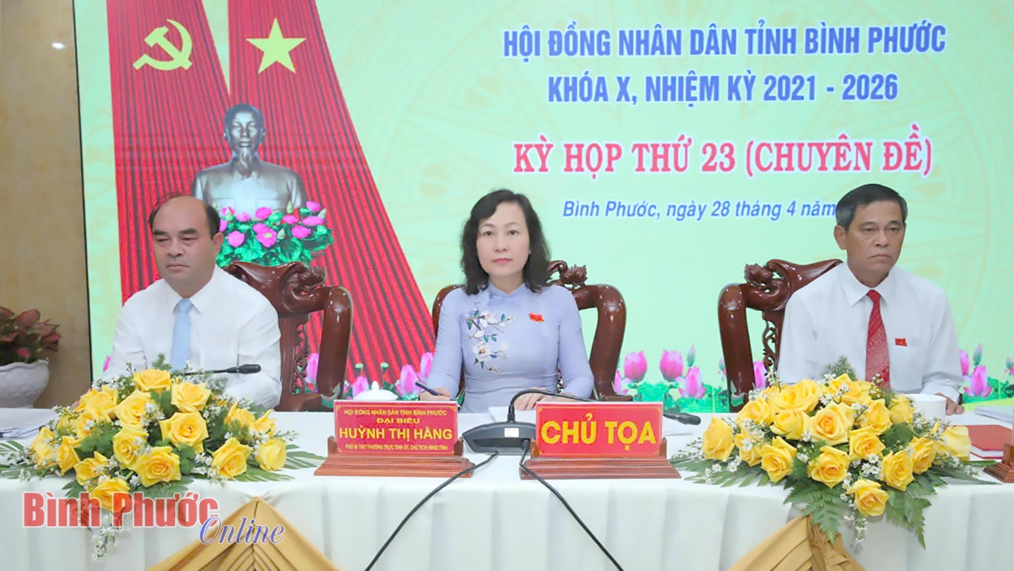 (CTTĐTBP) - Chiều 28/4, kỳ họp thứ 23 (chuyên đề) HĐND tỉnh khóa X, nhiệm kỳ 2021-2026 đã khai mạc dưới sự chủ trì của Phó Bí thư Thường trực Tỉnh ủy, Chủ tịch HĐND tỉnh Huỳnh Thị Hằng và các Phó Chủ tịch HĐND tỉnh: Nguyễn Tấn Hải, Huỳnh Hữu Thiết. Kỳ họp nhằm kịp thời xem xét, quyết định một số vấn đề quan trọng của tỉnh. Ủy viên dự khuyết Trung ương Đảng, Bí thư Tỉnh ủy Tôn Ngọc Hạnh dự kỳ họp.