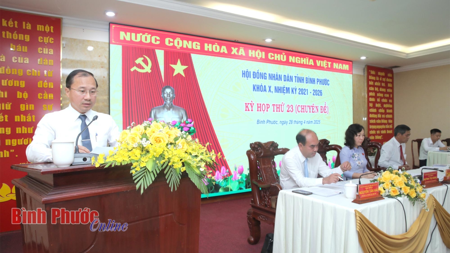 Kỳ họp đã xem xét báo cáo về các tờ trình của UBND tỉnh, gồm: Tờ trình số 67/TTr-UBND ngày 21/4/2025 của UBND tỉnh về việc cho ý kiến mức tỷ lệ (%) để tính đơn giá thuê đất, mức tỷ lệ (%) để tính đơn giá thuê đất đối với đất xây dựng công trình ngầm, mức tỷ lệ (%) để tính đơn giá thuê đất đối với đất có mặt nước trên địa bàn tỉnh Bình Phước; Tờ trình số 68/TTr-UBND ngày 21/4/2025 của UBND tỉnh về việc thông qua chủ trương thống nhất phương án giao UBND tỉnh Đồng Nai là cơ quan chủ quản thực hiện dự án đầu tư xây dựng cầu Mã Đà; Tờ trình số 69/TTr-UBND ngày 22/4/2025 của UBND tỉnh về chủ trương sắp xếp đơn vị hành chính cấp tỉnh, cấp xã của tỉnh Bình Phước.