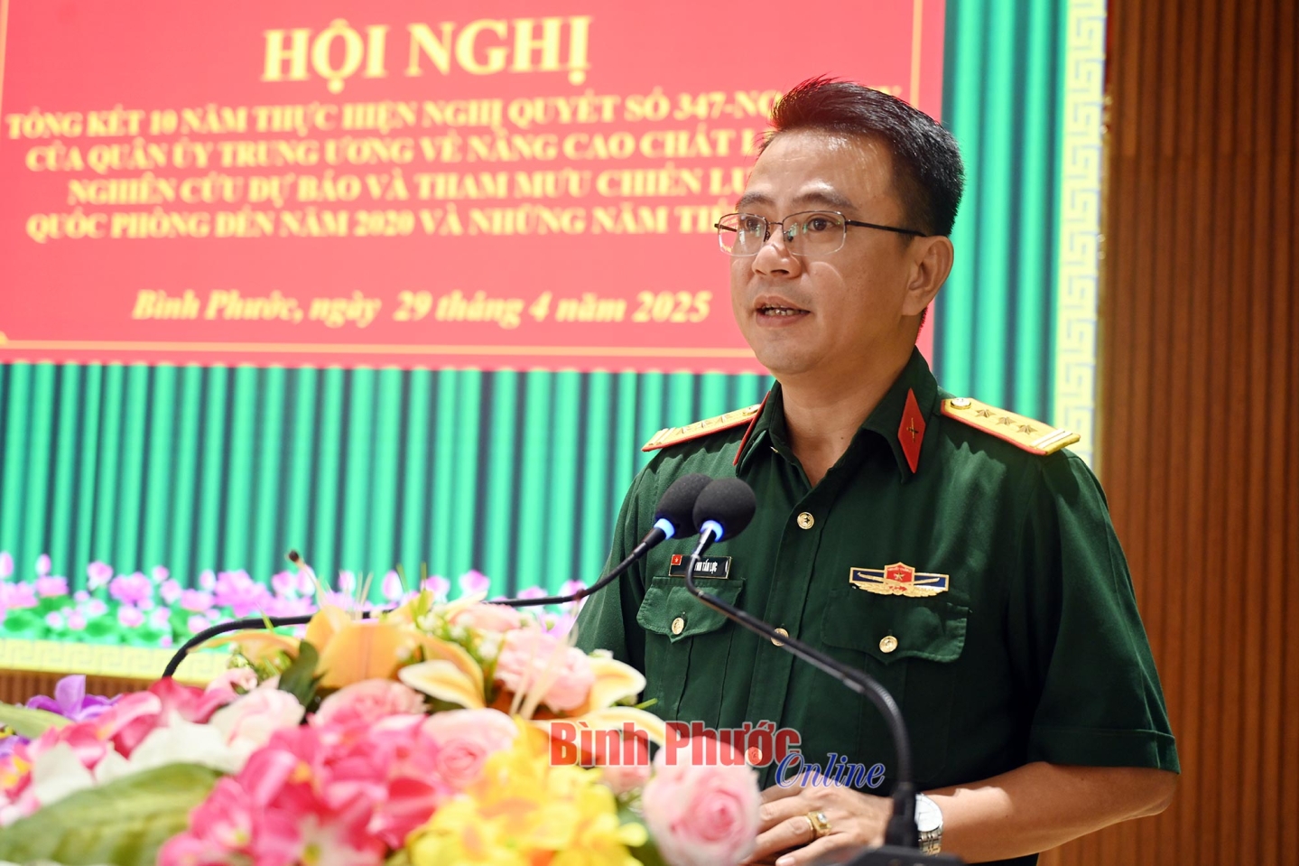 (CTTĐTBP) - Ngày 29/4, Ủy viên dự khuyết Trung ương Đảng, Bí thư Tỉnh ủy Tôn Ngọc Hạnh dự hội nghị tổng kết 10 năm thực hiện Nghị quyết 347 ngày 23/5/2015 của Quân ủy Trung ương về nâng cao chất lượng nghiên cứu, dự báo và tham mưu chiến lược quốc phòng đến năm 2020 và những năm tiếp theo. Hội nghị do Đảng ủy Quân sự tỉnh tổ chức.