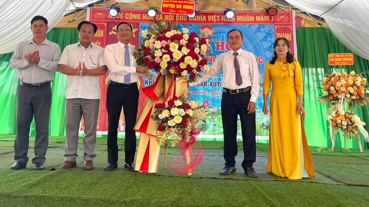 Lãnh đạo Huyện uỷ, UBND, Uỷ ban MTTQ Việt Nam huyện tặng hoa chúc mừng các bộ và nhân dân thôn Đắk Xuyên