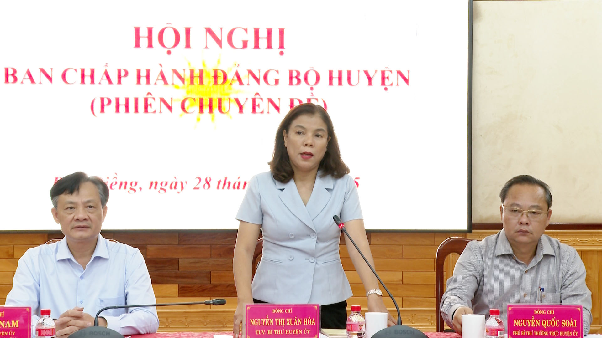 Các đồng chí: Bí thư Huyện ủy Nguyễn Thị Xuân Hòa, Chủ tịch HĐND huyện Nguyễn Quốc Soài, Chủ tịch UBND huyện Lê Anh Nam chủ trì hội nghị.