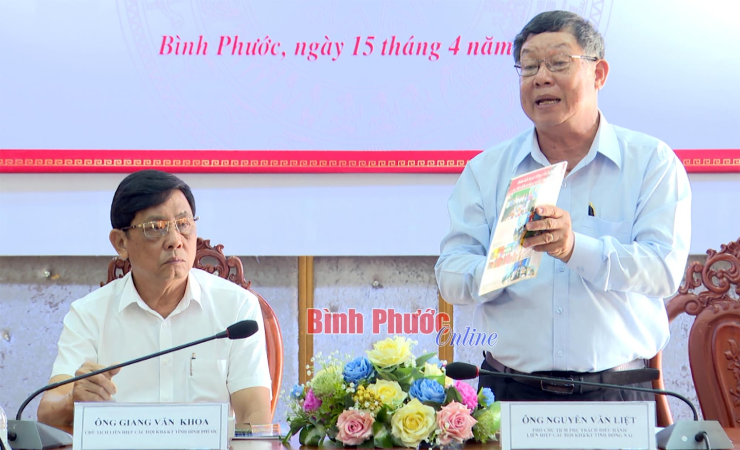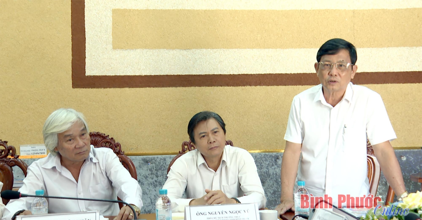 Ông Giang Văn Khoa, Chủ tịch Liên hiệp các hội Khoa học và Kỹ thuật tỉnh Bình Phước (bìa phải) phát biểu tại buổi làm việc