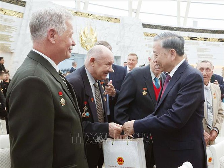 Tổng Bí thư Tô Lâm thăm hỏi, tặng quà các cựu quân nhân, chuyên gia Belarus và những người bạn Belarus từng có đóng góp nổi bật cho Việt Nam. Ảnh: TTXVN