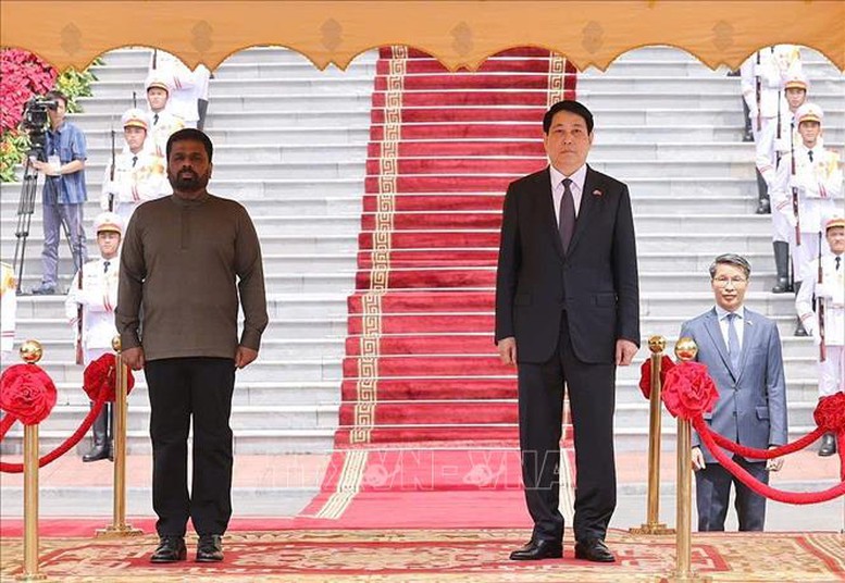 Chủ tịch nước Lương Cường và Tổng thống Sri Lanka Anura Kumara Dissanayaka duyệt Đội danh dự Quân đội nhân dân Việt Nam. Ảnh: TTXVN