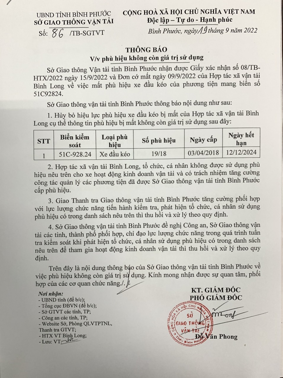 Thông báo phù hiệu không còn giá trị sử dụng