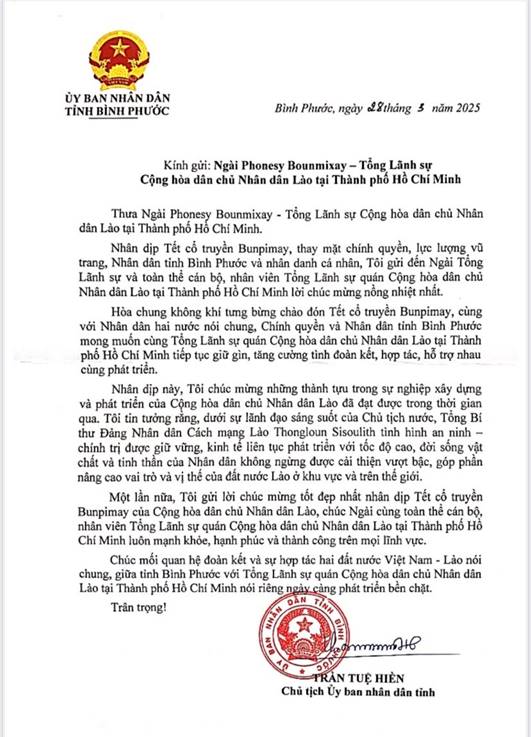 Nhân dịp Tết cổ truyền Bun Pi Mây năm 2025 của Nhân dân Lào, Chủ tịch UBND tỉnh Bình Phước Trần Tuệ Hiền đã gửi Thư chúc mừng đến Ngài Phonesy Bounmixay – Tổng Lãnh sự nước Cộng hòa dân chủ nhân dân Lào tại Thành phố Hồ Chí Minh.