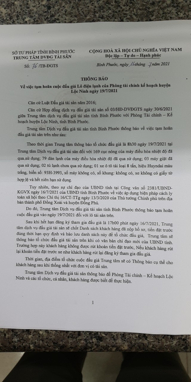 Do đó, Trung tâm Dịch vụ đấu giá tài sản tỉnh Bình Phước thông báo tạm hoãn cuộc đấu giá vào ngày 19/7/2021 đối với lô tài sản trên.
