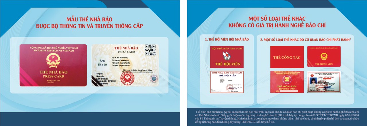 - Khi phóng viên các cơ quan báo chí đến liên hệ làm việc, cơ quan, đơn vị có quyền và trách nhiệm yêu cầu phóng viên xuất trình Thẻ Nhà báo (Mẫu Thẻ chụp kèm theo) được Bộ Thông tin và Truyền thông cấp, các loại Thẻ khác không có giá trị hành nghề.