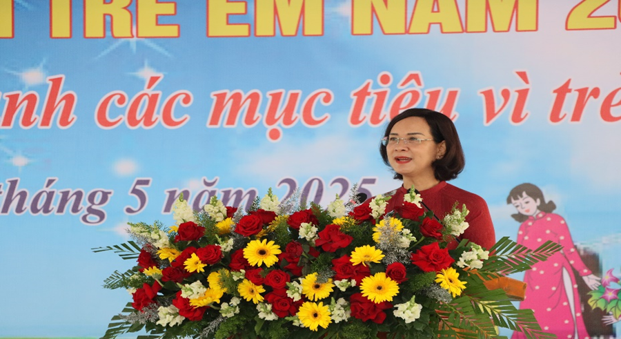 Đ/c Trần Tuyết Minh - Ủy viên Ban Thường vụ Tỉnh ủy, Phó Chủ tịch UBND tỉnh, Trưởng Ban Chỉ đạo Chương trình hành động quốc gia Vì trẻ em tỉnh phát biểu phát động Tháng Hành động Vì trẻ em năm 2025