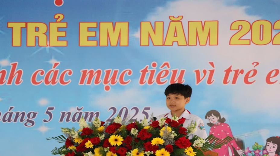 Em Trịnh Ngọc Duy Anh - Học sinh Trường THCS Tân Tiến, huyện Đồng Phú, đại diện cho trẻ em toàn tỉnh đã lên phát biểu cảm ơn, bày tỏ cảm nghĩ, ước mơ của trẻ em và gửi gắm thông điệp mong muốn nhận được sự quan tâm, chăm lo của toàn xã hội dành cho trẻ em.
