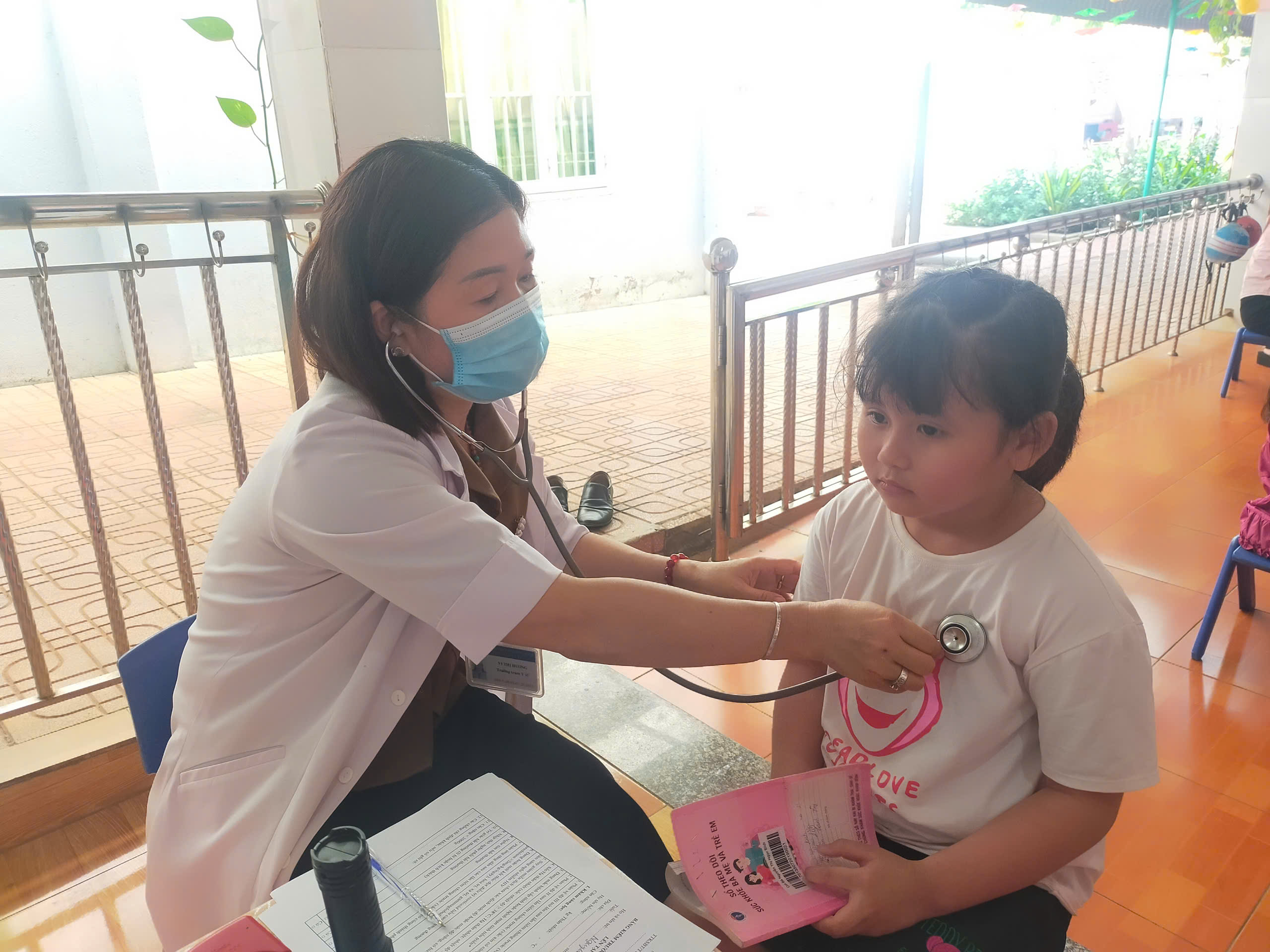 Trưởng trạm Y tế phường Tân Bình, TP Đồng Xoài khám cho trẻ trước khi tiêm vắc xin sởi
