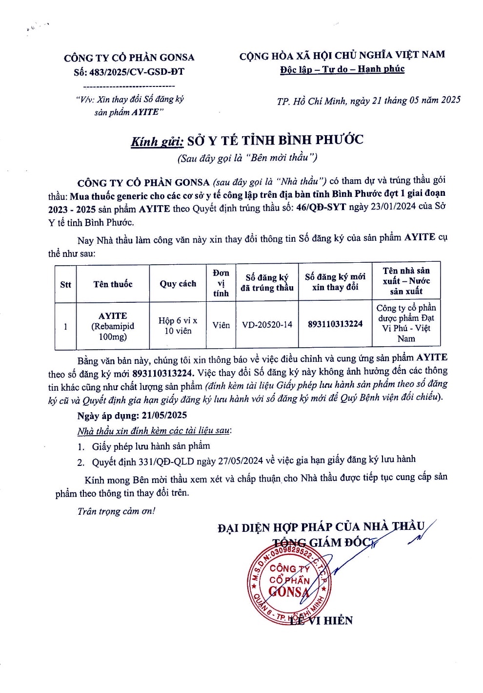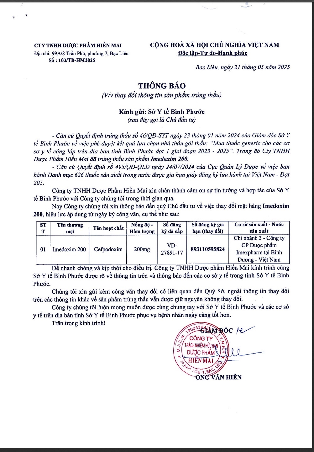 Sở Y tế thống nhất cập nhật thông tin thay đổi thuốc trúng thầu sau: