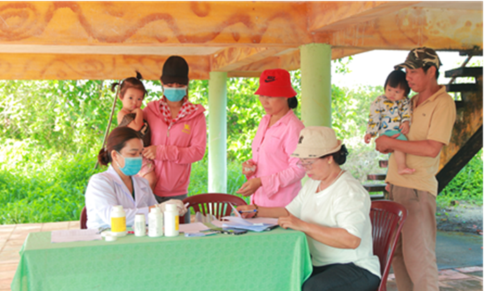 Người dân thôn 7, xã Long Bình, huyện Phú Riềng đưa trẻ uống vitamin A và tẩy giun