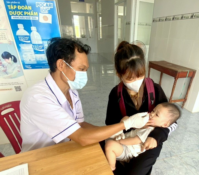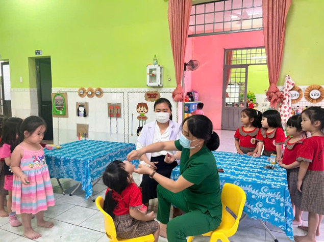 Nhân viên trạm y tế phường Tân Bình, thành phố Đồng Xoàicho trẻ uống vitamin A tại các trường mầm non của phường